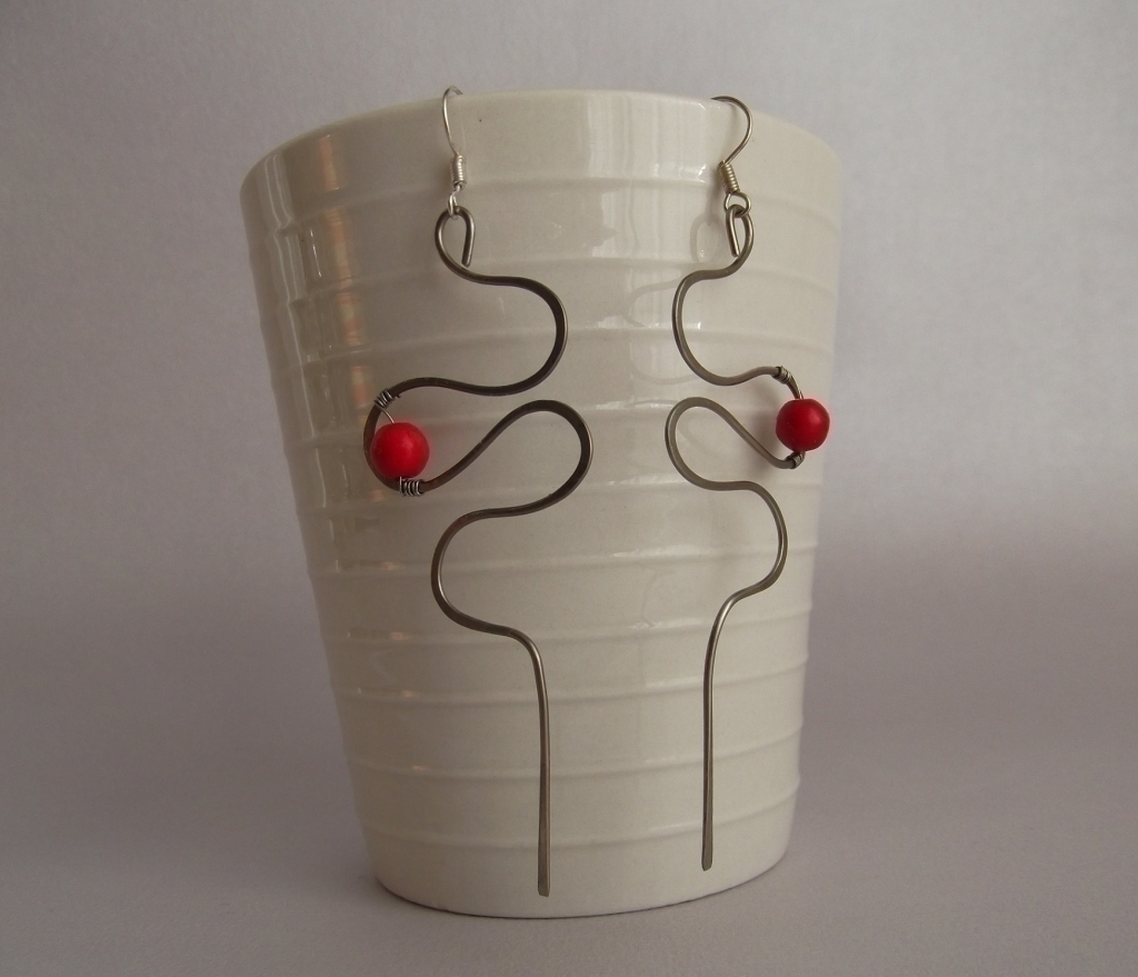 Červená perlička z howlitu se houpe na vlnkách z chir. drátu.