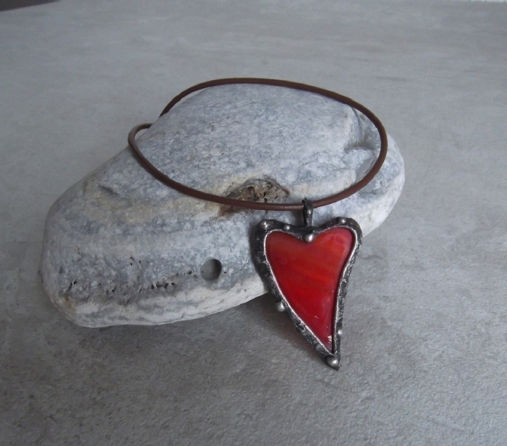 Nádherný materiál - sklo Spektrum červené, cín, patina, kožený obojek - černý.