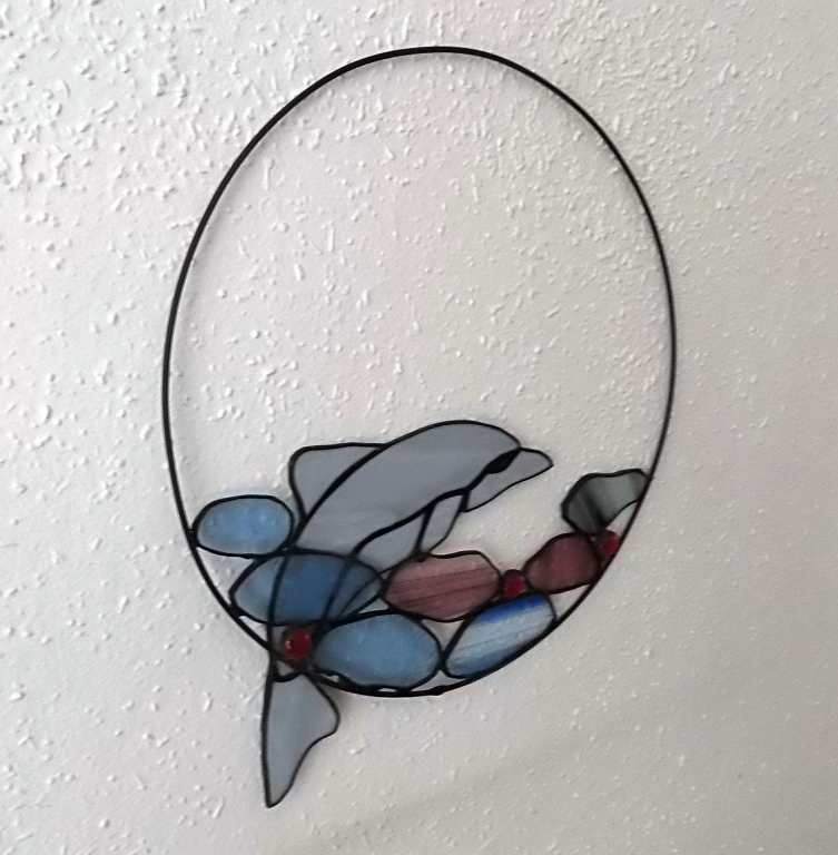 Závěsná vitráž skákajícího delfína. Lze zavěsit na stěnu, nebo do okna.