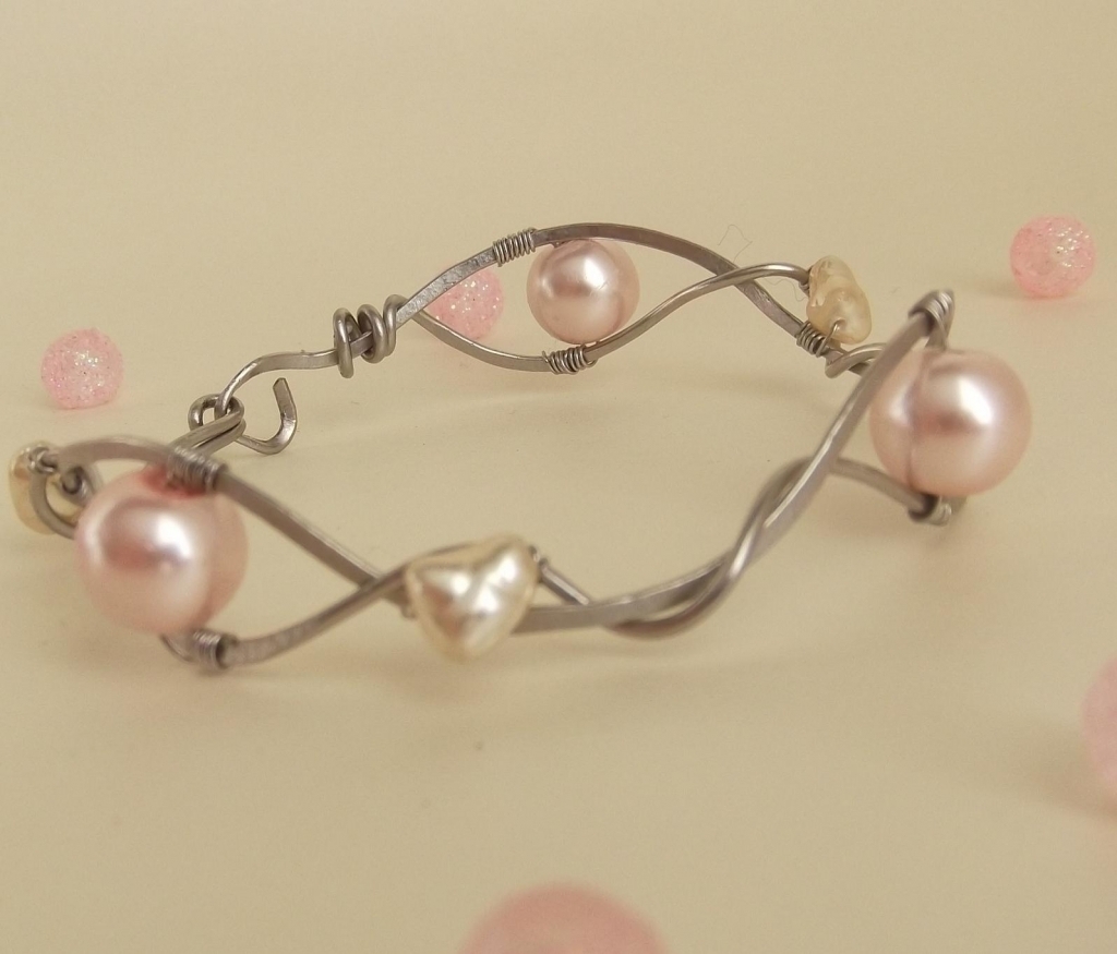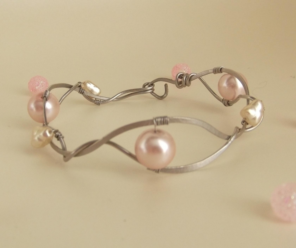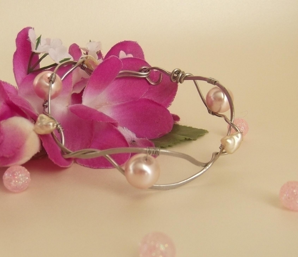 Tento  náramek je navržen a zhotoven z tepaného chirurgického drátu, do něhož jsou vloženy růžové perly a říční perly. Tento originální šperk bude vyjadřovat Vaši osobnost, originalitu a spontaneitu.