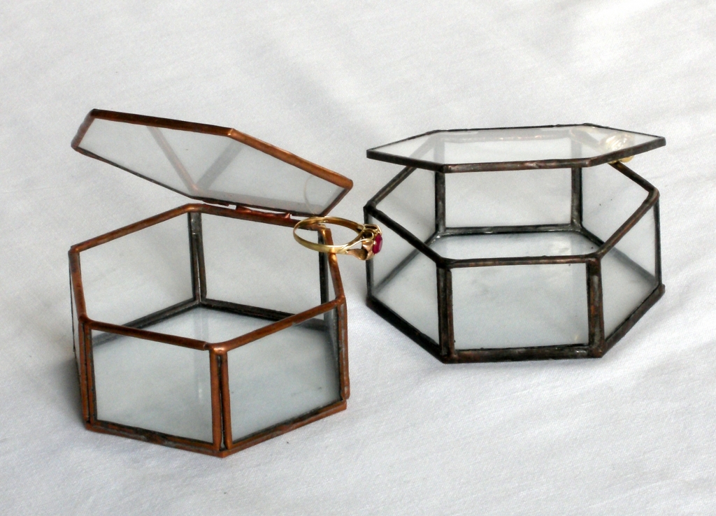 Nádherná krabička z průhledného skla. Cínové spoje jsou napatinovány tmavě, nebo měděně. Krabičku lze využít jako šperkovnici, nebo ji vyplnit voňavými květy růží z nějaké důležité kytice a vytvořit tak originální dílko a upomínku na romantickou chvíli.