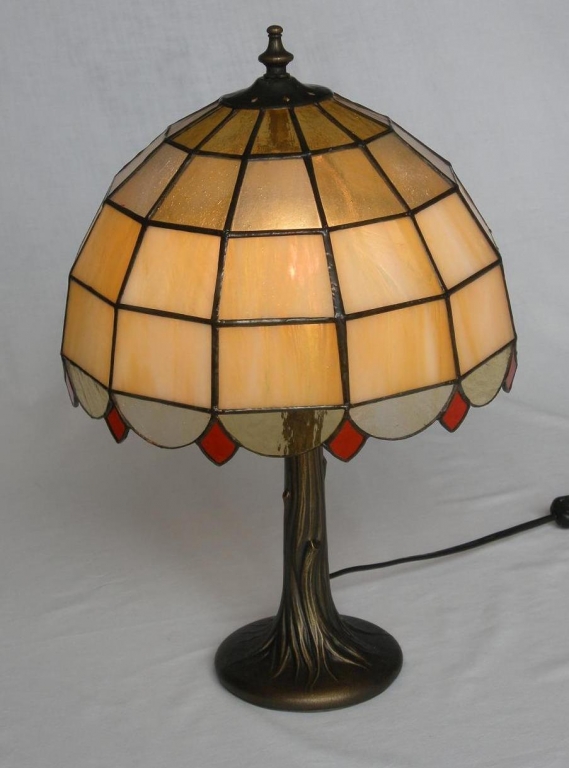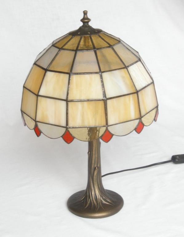 Tiffany lampa z opálových skel průhledných a neprůhledných. Skla spektrum béžových odstínů a červené - dovoz USA.