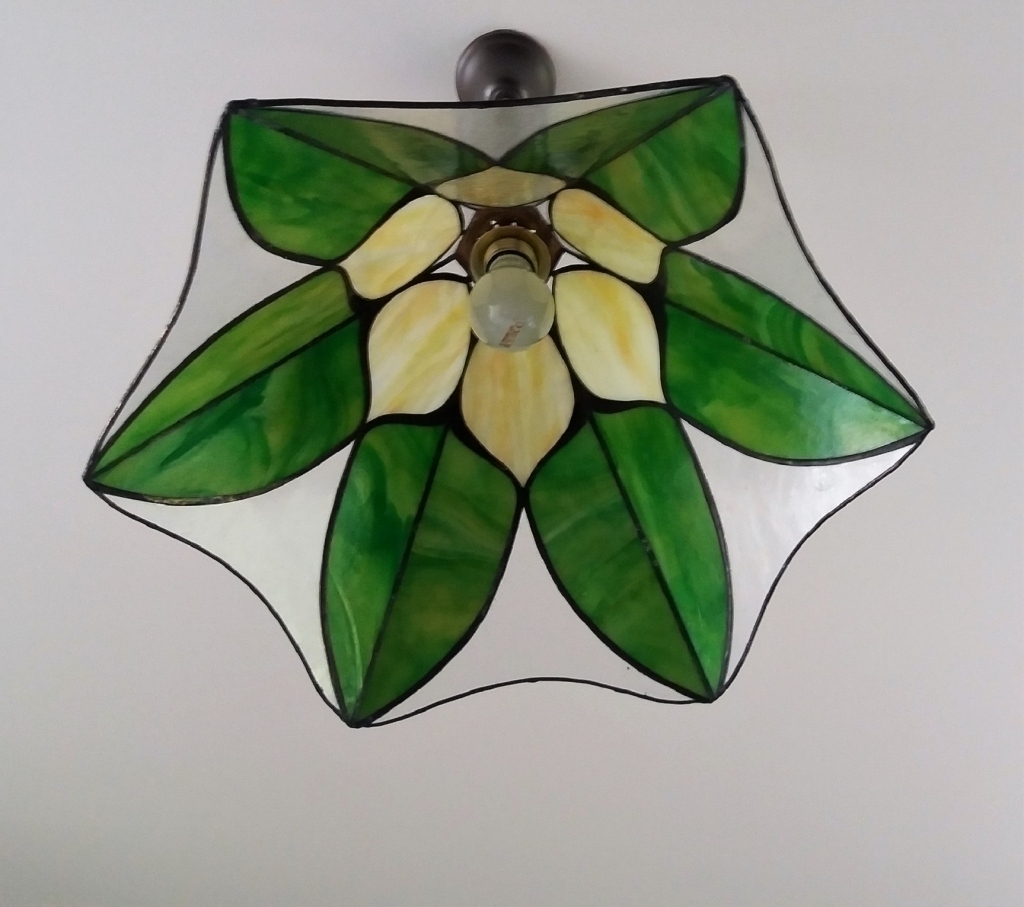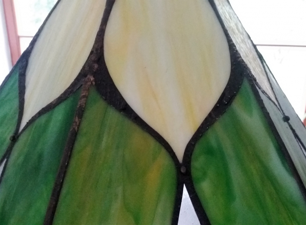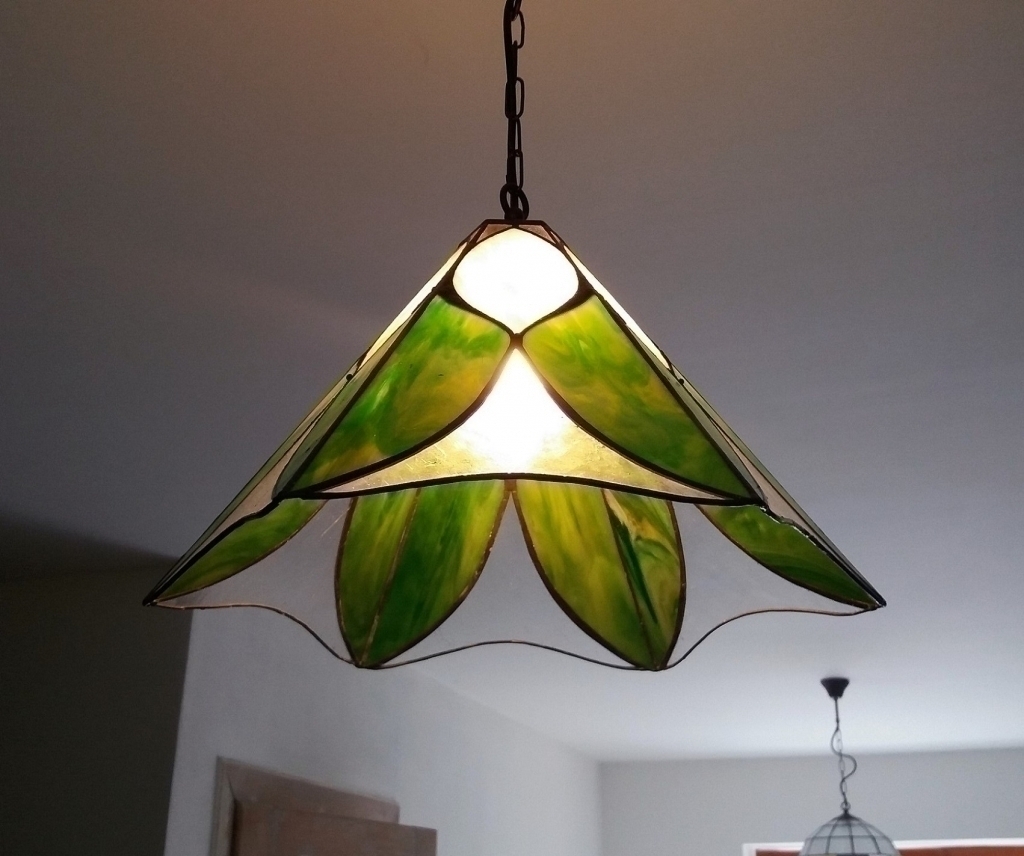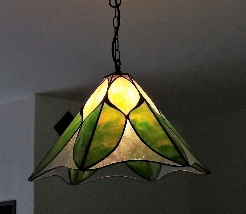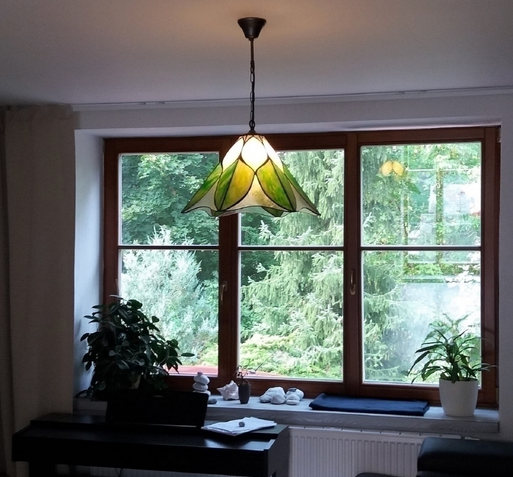 Lustr jsem zhotovila z luxusního materiálu - sklo KOKOMO - zelená žlutě žíhaná, sklo SPEKTRUM - žlutá žíhaná a průhledná, matná -strukturovaný povrch. Cín, tmavá patina.