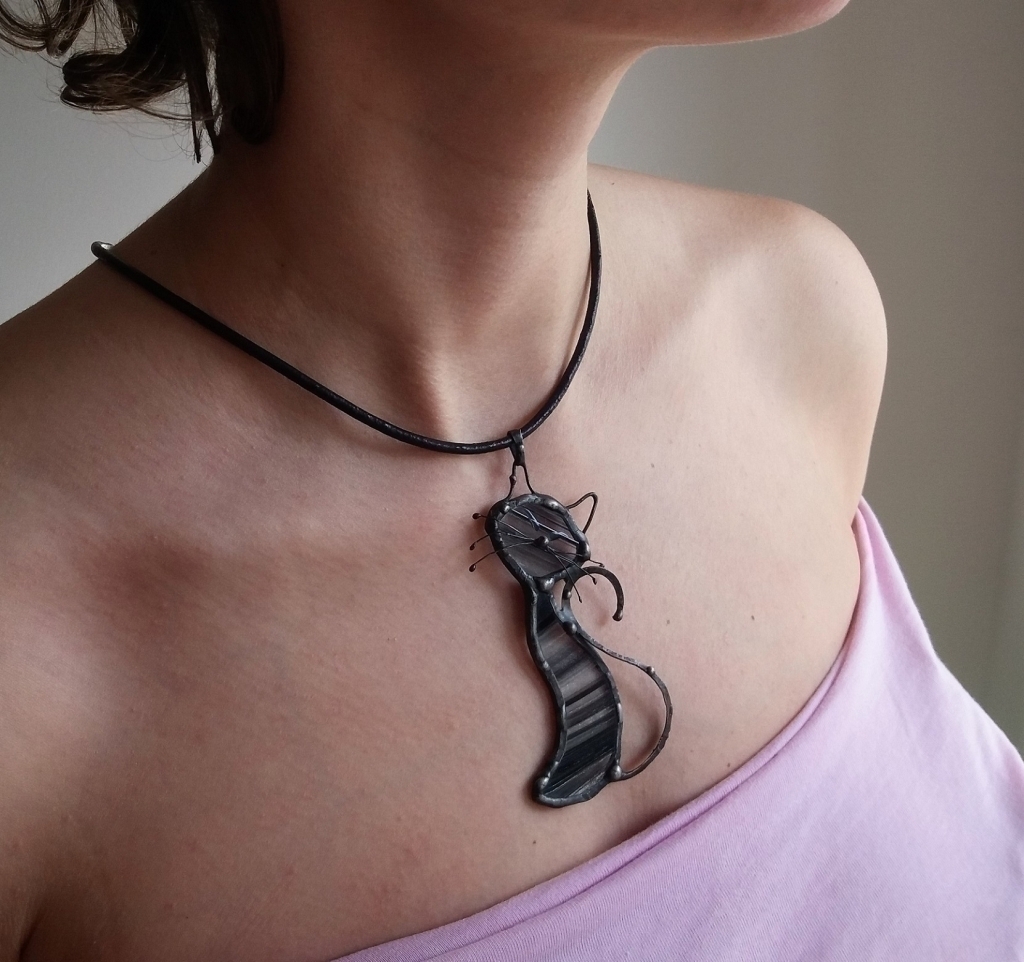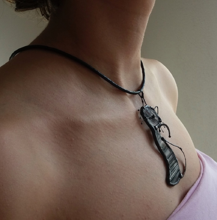 Materiál: sklo Baroque průhledné černé žíhané, drátek měděný, tepaný, tvarovaný, cín, tmavá patina, kožený obojek černý.