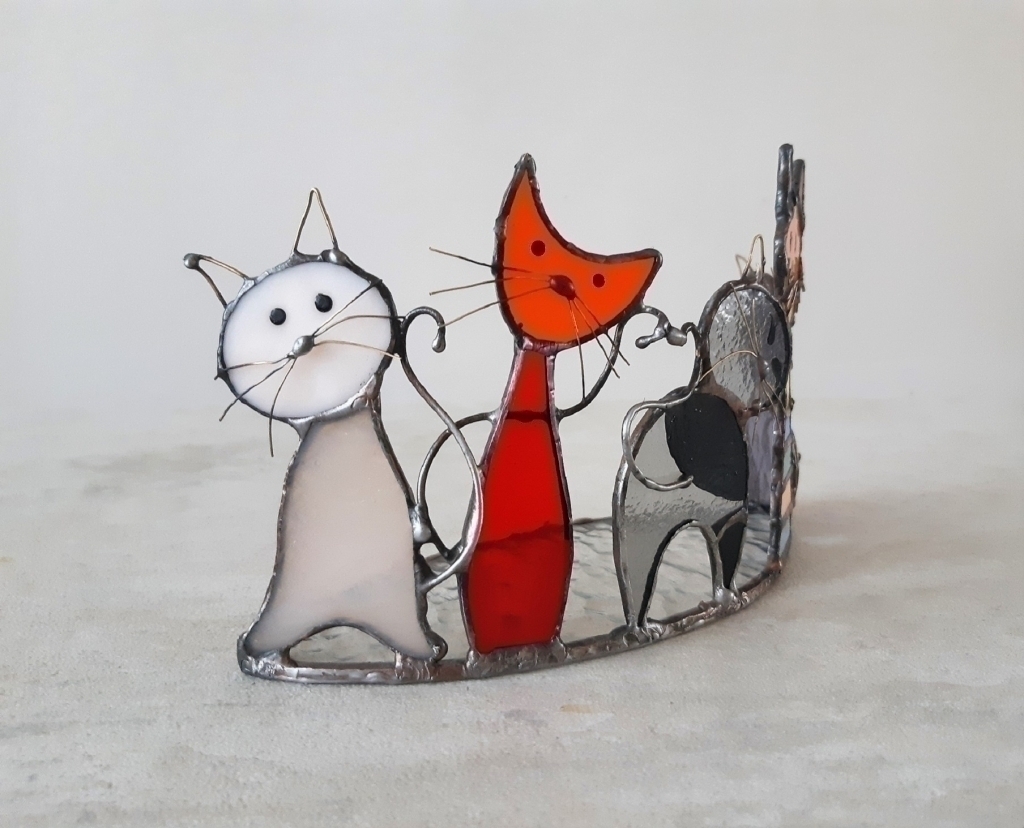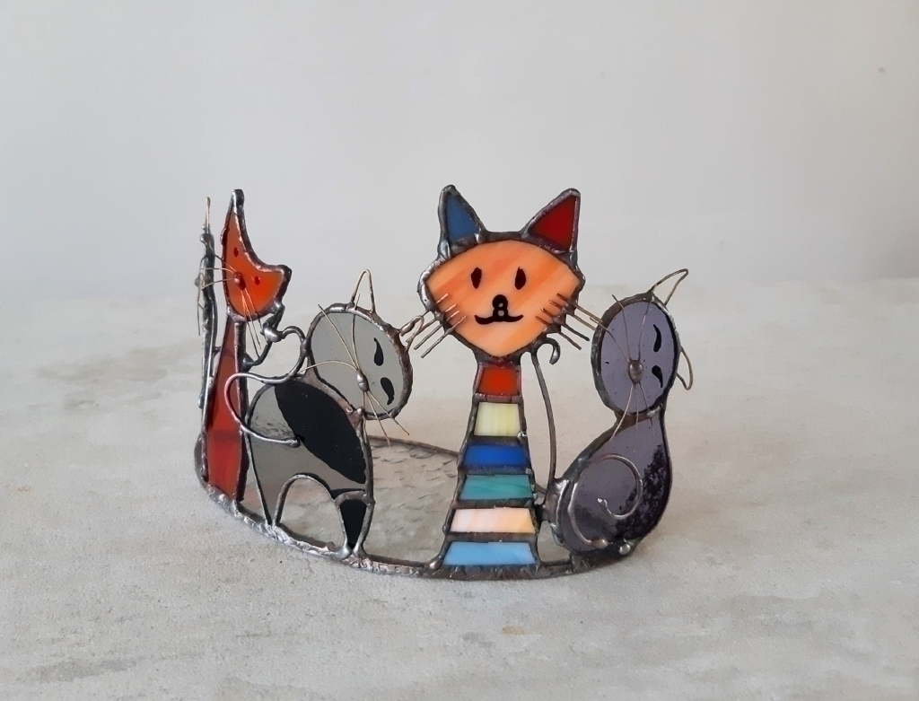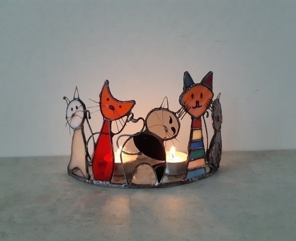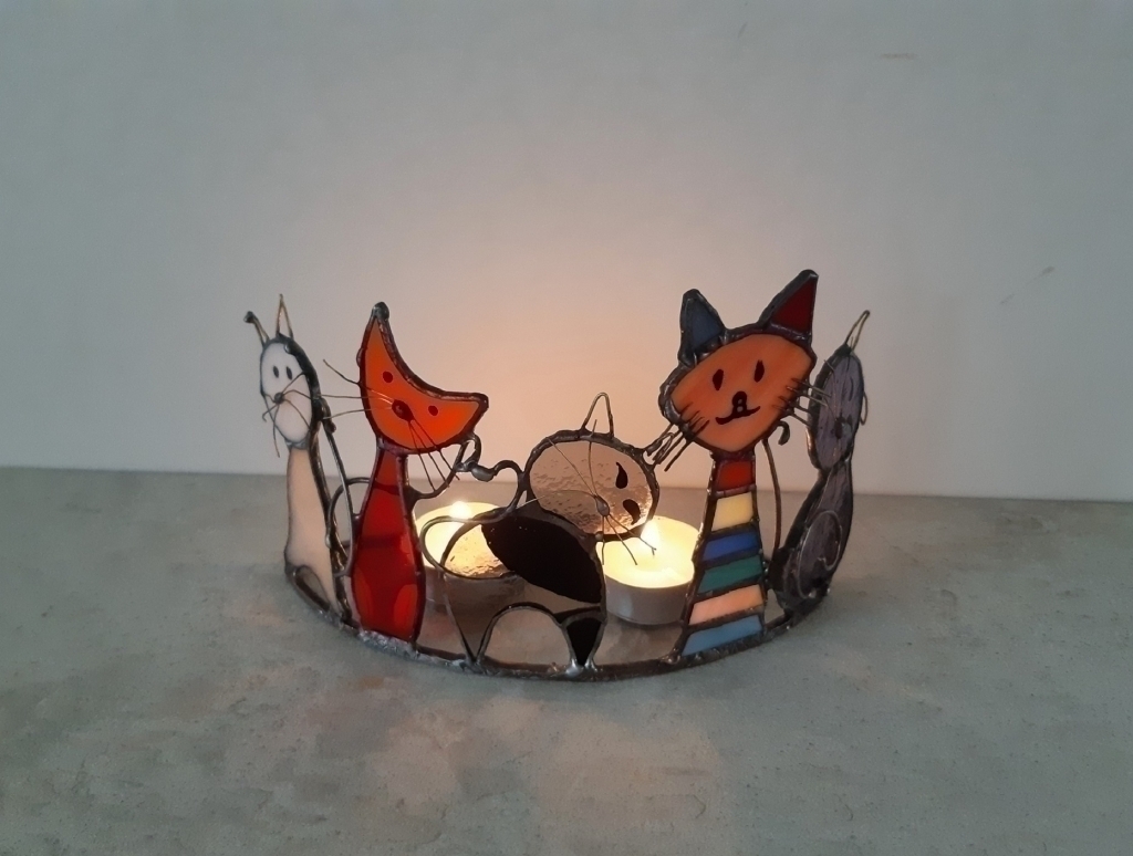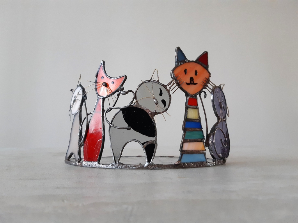 Materiál: sklo Spektrum, tepaný měděný drát, cín, patina.