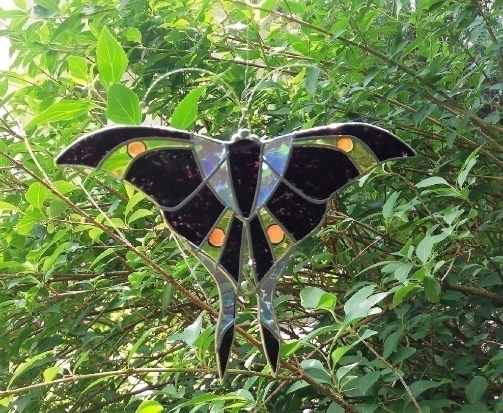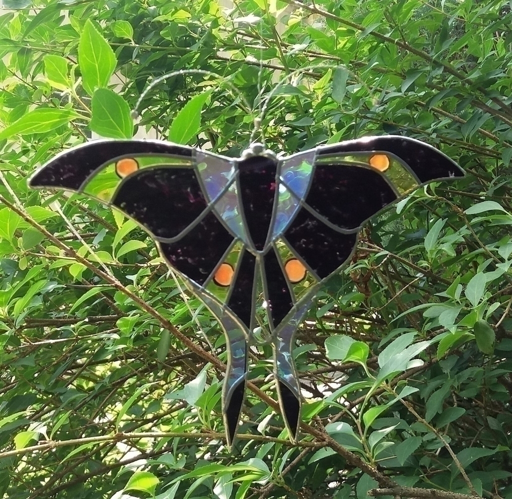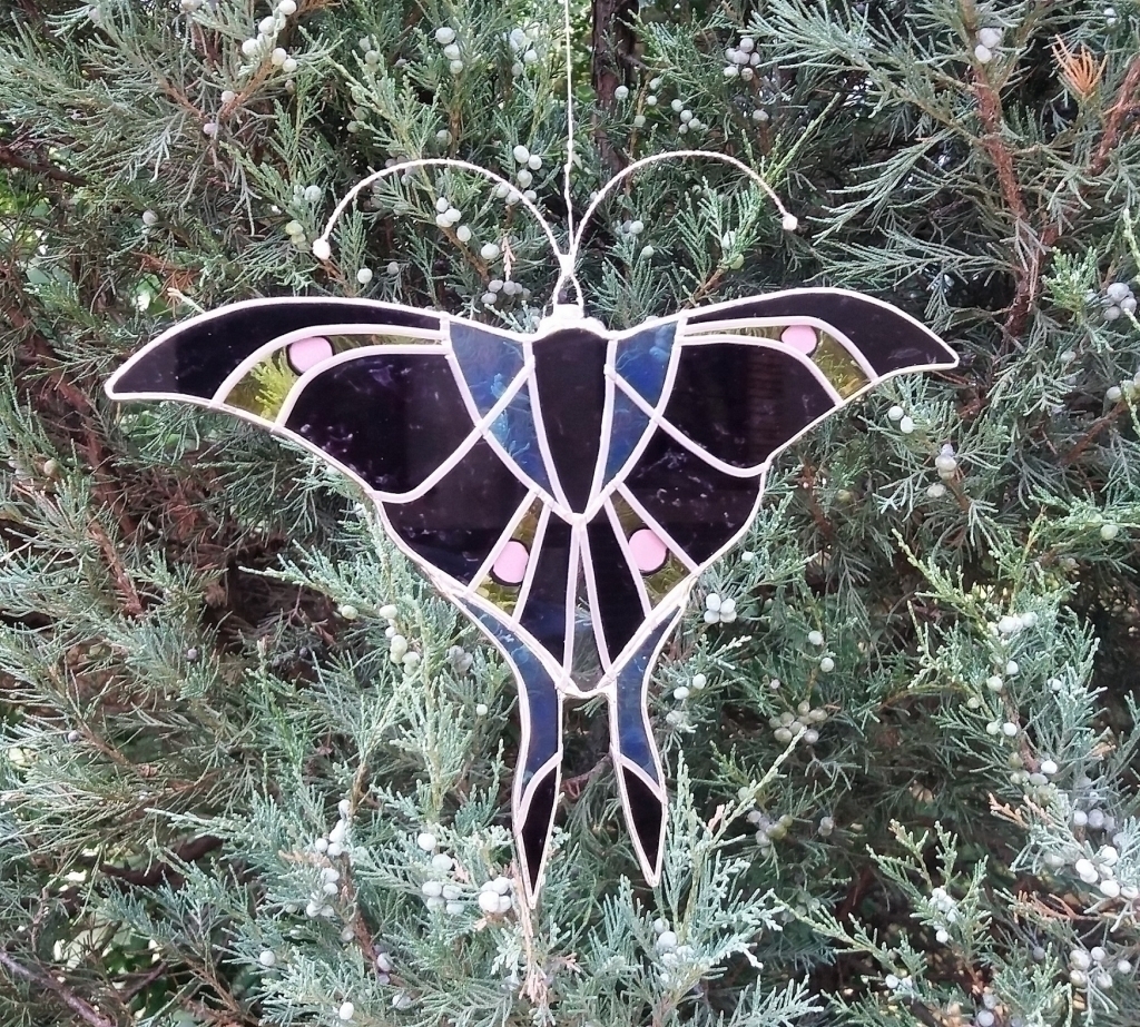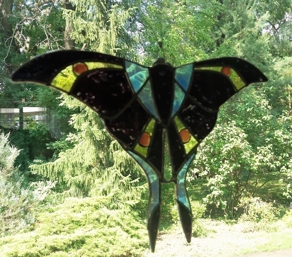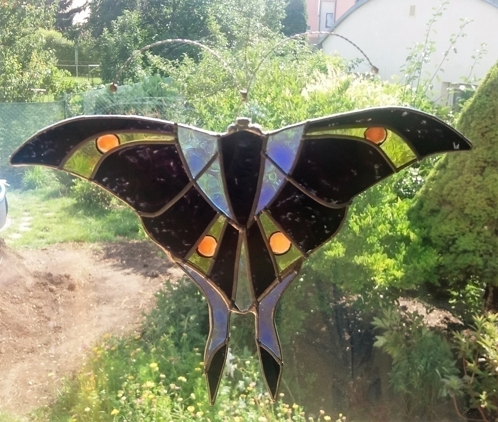 Nádherný motýl. Kombinace vitráže s americkou vitráží a malování skla. Zavěšené v okně, celé dílo prosvítí sluneční, nebo denní paprsky a motýl vynikne v celé své kráse.
