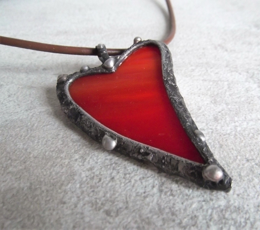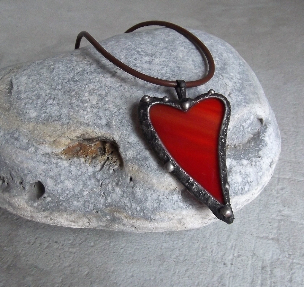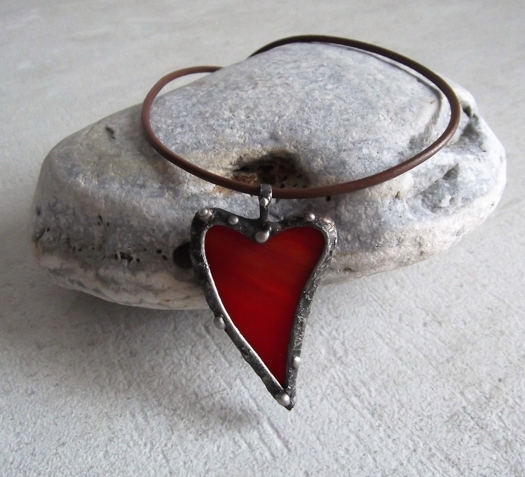 Nádherný materiál. Sklo Spektrum, rozměr: 4 x 6,5cm, měděný drátek, cín, tmavá patina, kožený obojek černý.