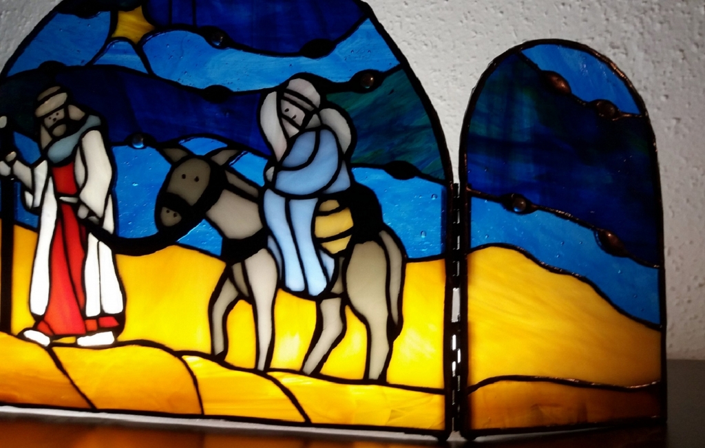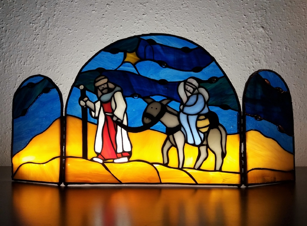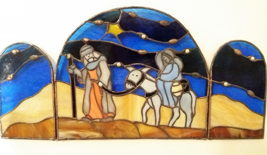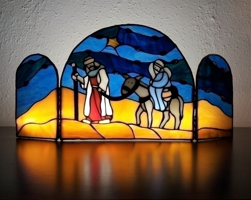 Josef hledá pro těhotnou pannu Marii přístřeší. Na cestě je doprovází kometa ohlašující narození spasitele. Můžeme zavěsit na zeď (okno) jako obraz. Oba boční díly můžeme pootočit pod úhlem a celé dílo bezpečně položit na podložku, např. vedle vánočního stolku. Vypadá to nádherně, zvláště se světlem v pozadí.
